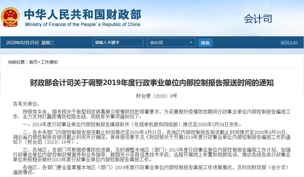 財(cái)政部會計(jì)司關(guān)于調(diào)整2019年度行政事業(yè)單位內(nèi)部控制報(bào)告報(bào)送...